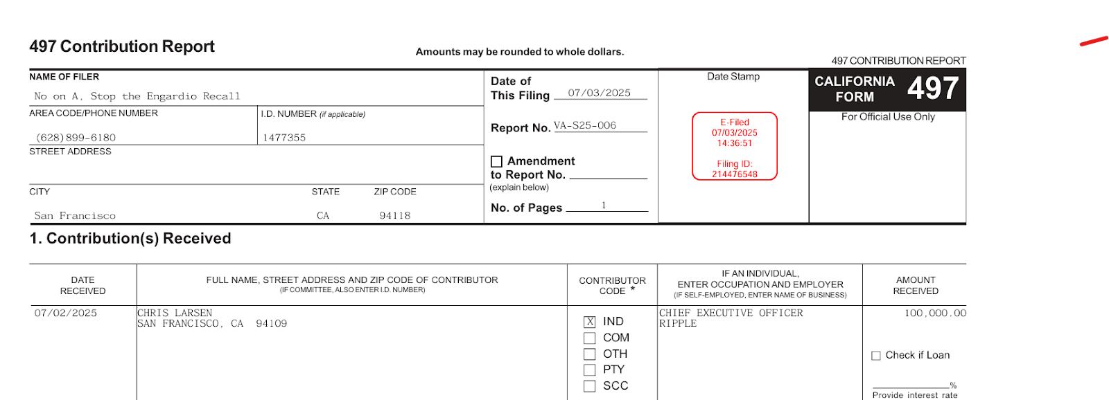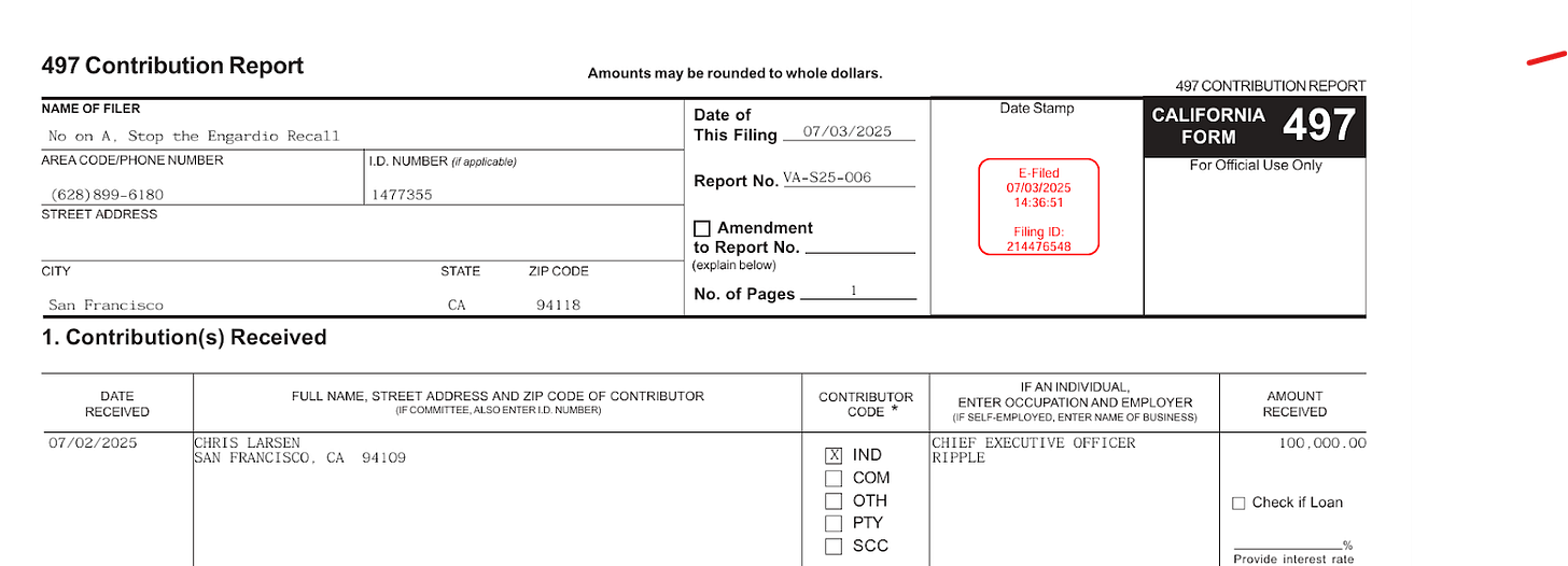 As I have mentioned in previous posts here, Chris Larsen, co-founder and CEO of the cryptocurrency exchange Ripple Labs, has risen to the top of the donor leaderboard of Supervisor Joel Engardio’s anti-recall campaign. Engardio is currently staring down the barrel of a recall, which would more aptly be described as grassroots, citizen-based political uprising.