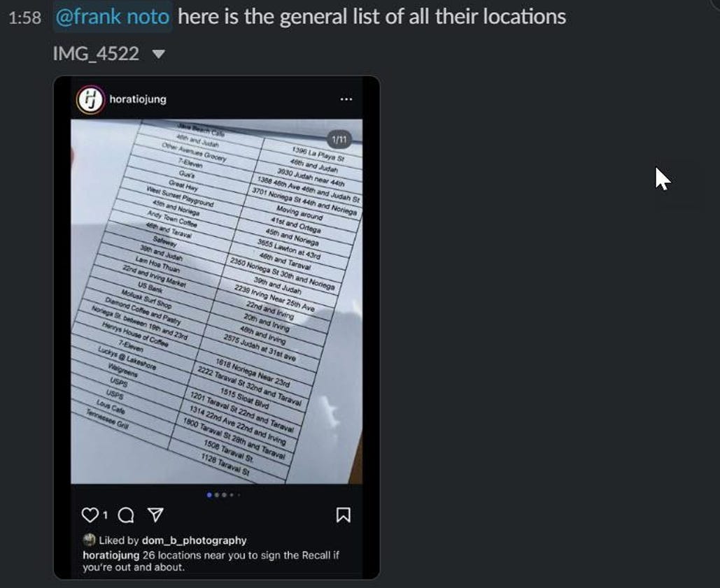 And now we have come full circle, and Supervisor Engardio is now handing out information to those in the Slack channel so they can go out and intimidate voters, potential petition signers and recall volunteers. I can personally attest to the fact that Engardio supporters did come to mobilization events just like the ones in this flyer and try to intimidate voters and volunteers.