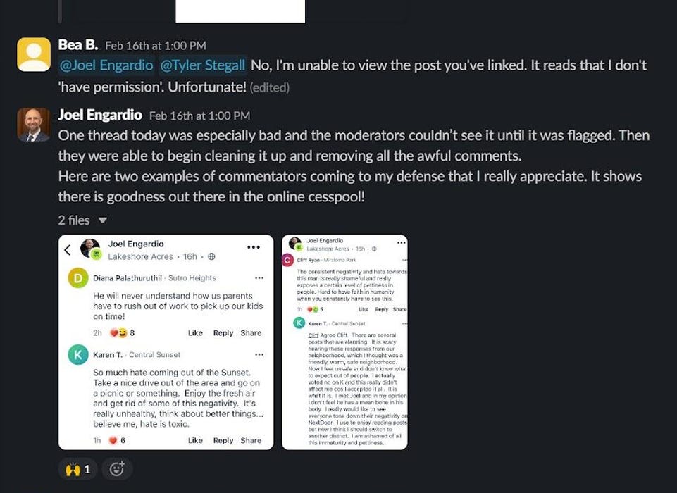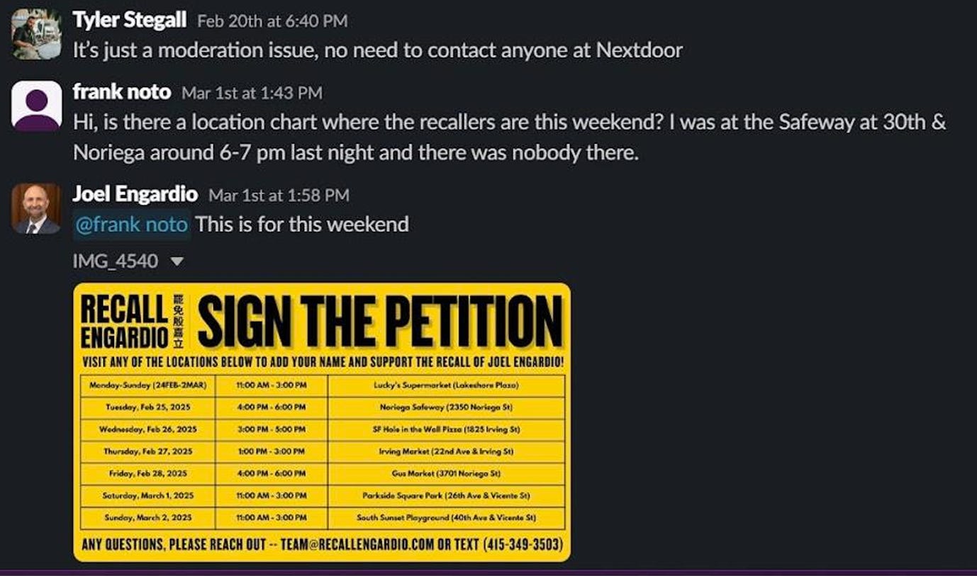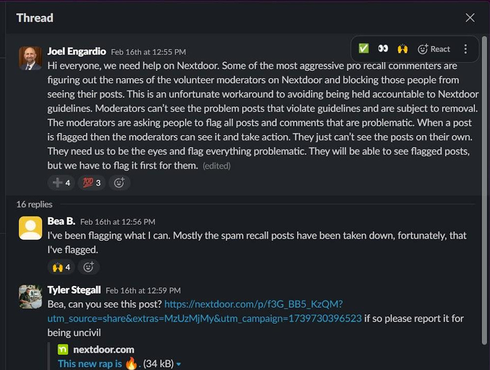 Back in February of this year, as the Recall Engardio Campaign was just getting started, Supervisor Joel Engardio and several key supporters, campaign staff and consultants created a Slack channel to discuss and ideate strategies to curtail negative statements, messages and discussions on multiple social media platforms, including Nextdoor and local Facebook groups.