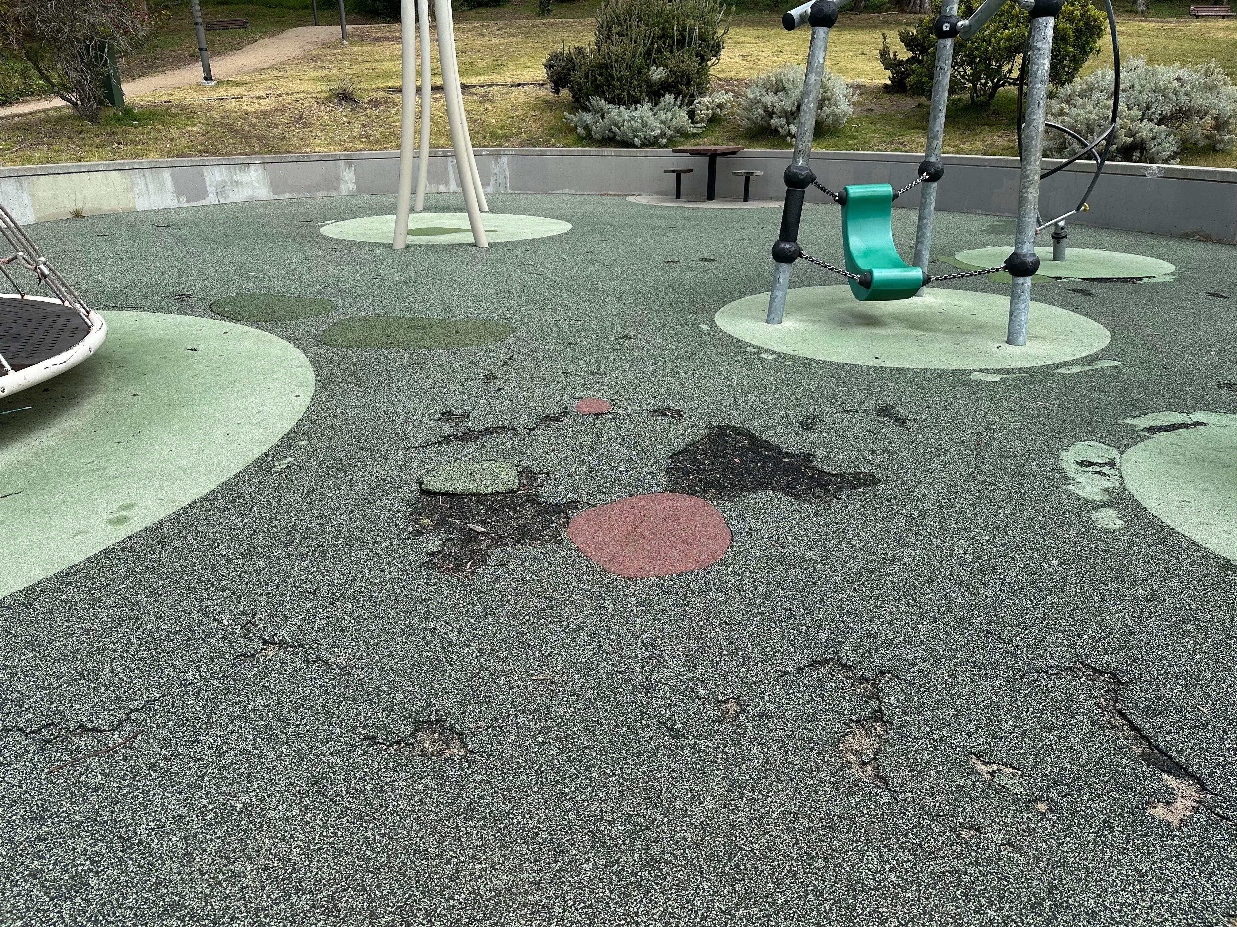 There’s just one problem. The playground’s rubbery safety surface resembles the face of the moon. Children regularly trip on the material, which has grown crumbly from 15 years of rain and sun, and sustain minor injuries, and some have been observed putting it in their mouths.