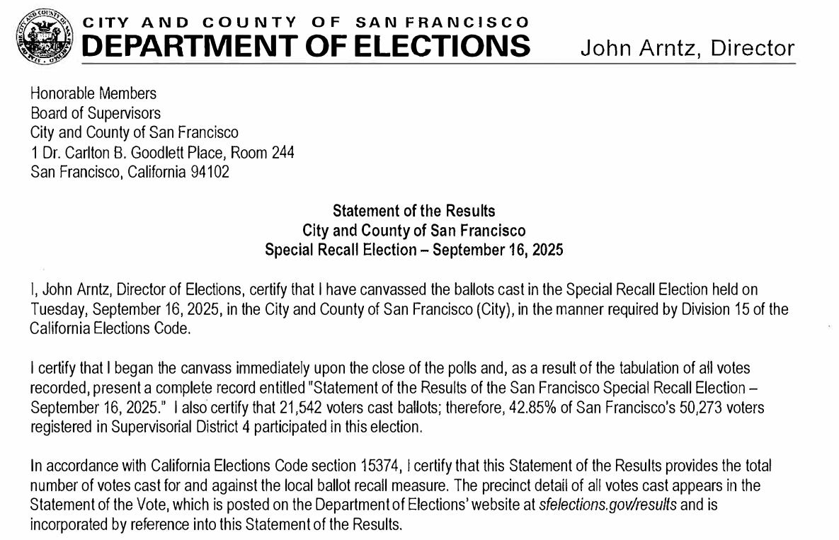 Perhaps I should not refer to Engardio as erstwhile yet? The San Francisco Board of Supervisors will meet on October 7th to hold the vote on the certification of the Recall election of Joel Engardio. I received a copy of the letter from the Department of Elections, signed by Director John Arntz, certifying the Recall and removal of Joel Engardio from the Office of Supervisor of the City and County of San Francisco. Yep, erstwhile it is, and I will just let history catch up with me on October 7th.