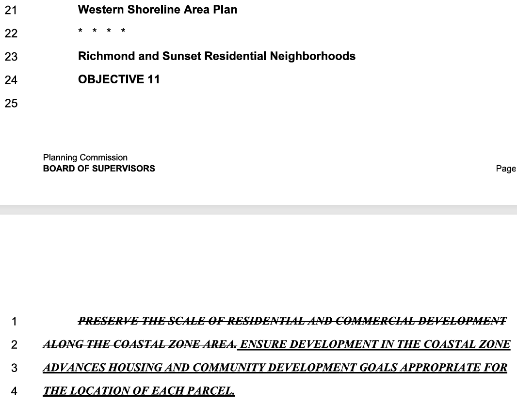 The Western Area Shoreline Plan policy objectives, as amended, would read — “ENSURE DEVELOPMENT IN THE COASTAL ZONE ADVANCES HOUSING AND COMMUNITY DEVELOPMENT GOALS APPROPRIATE FOR THE LOCATION OF EACH PARCEL.”
