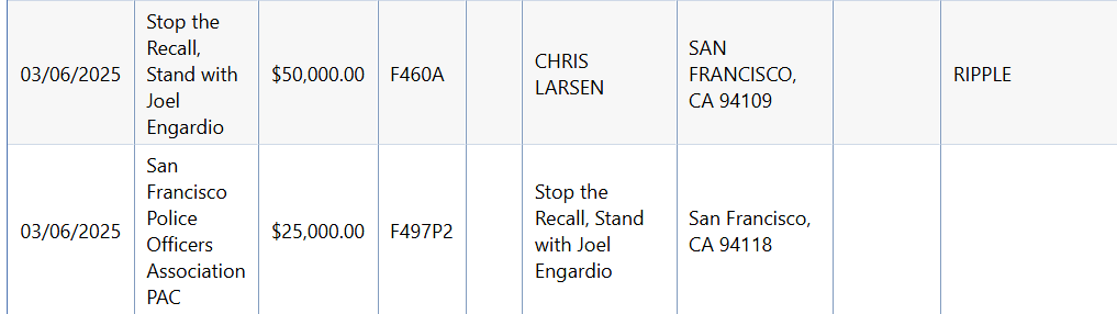 Here is how it also goes. Chris Larsen decides to go in heavy to support his favorite embattle Supervisor, Joel Engardio. He tells his friends at the SFPOA, and they join him in also giving Joel a check. When Larsen throws down $50K on March 6th the SFPOA throws in $25K on the very same day.