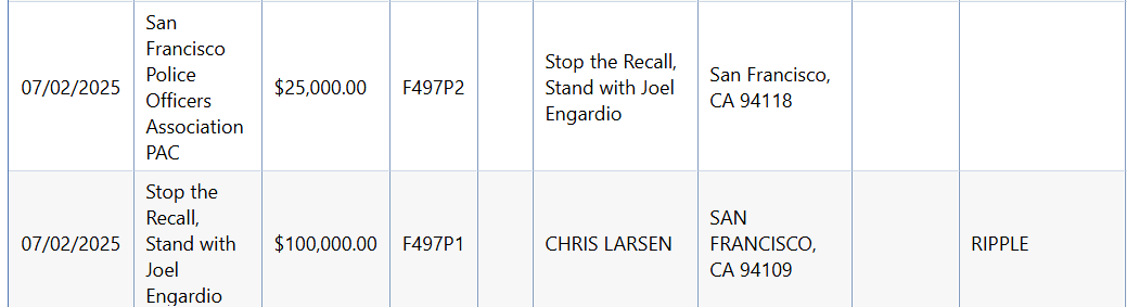 When Larsen throws in another whopping $100,000 to support Joel on July 2nd, he tells the SFPOA, and they throw in $25K on the very same day.