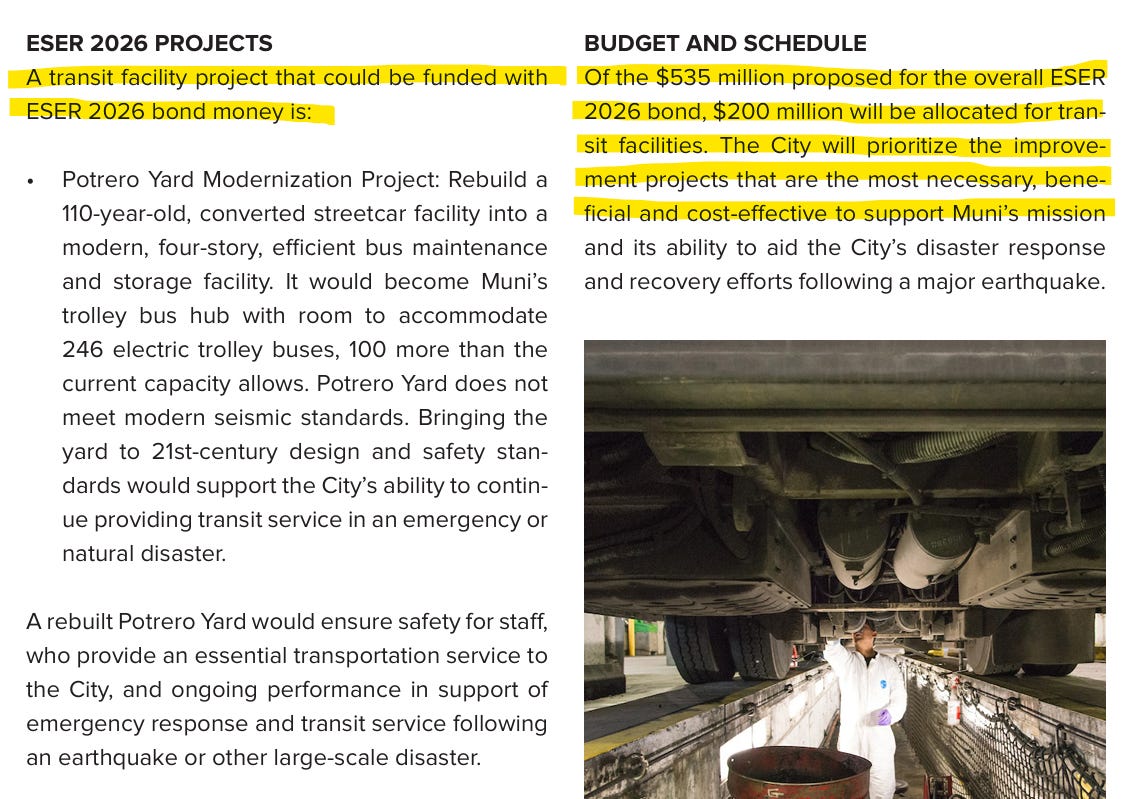 Imagine for a moment, in a parallel universe where no one is around to point out the deficiencies in the June 2026 ESER Bond; and that the measure goes into effect and SFMTA rakes in the $200 million set aside in the bond for Muni. And then imagine, low-and-behold, the Potrero Bus Facility doesn’t get prioritized for repair, as all the ballot materials have suggested it will be.
