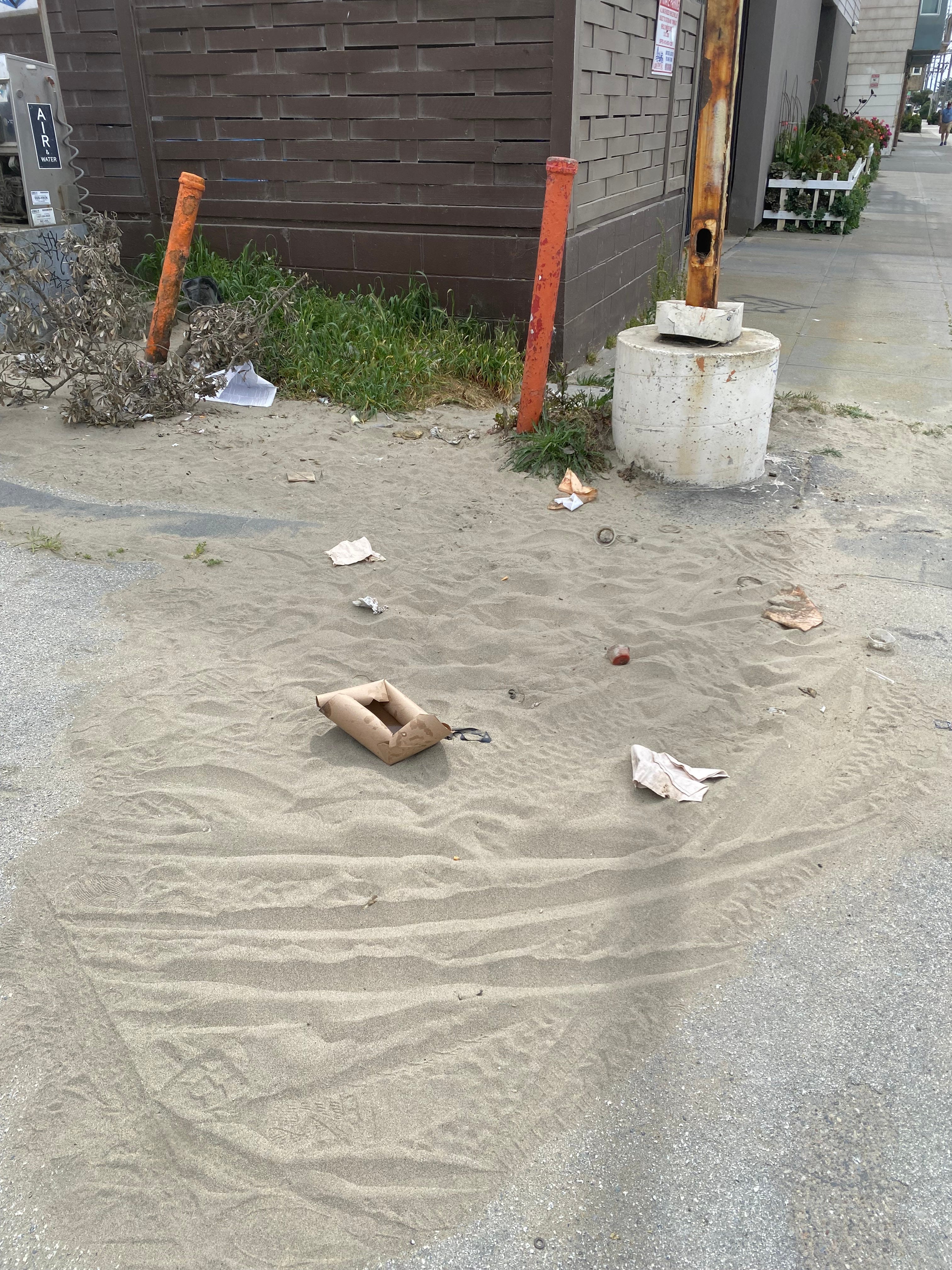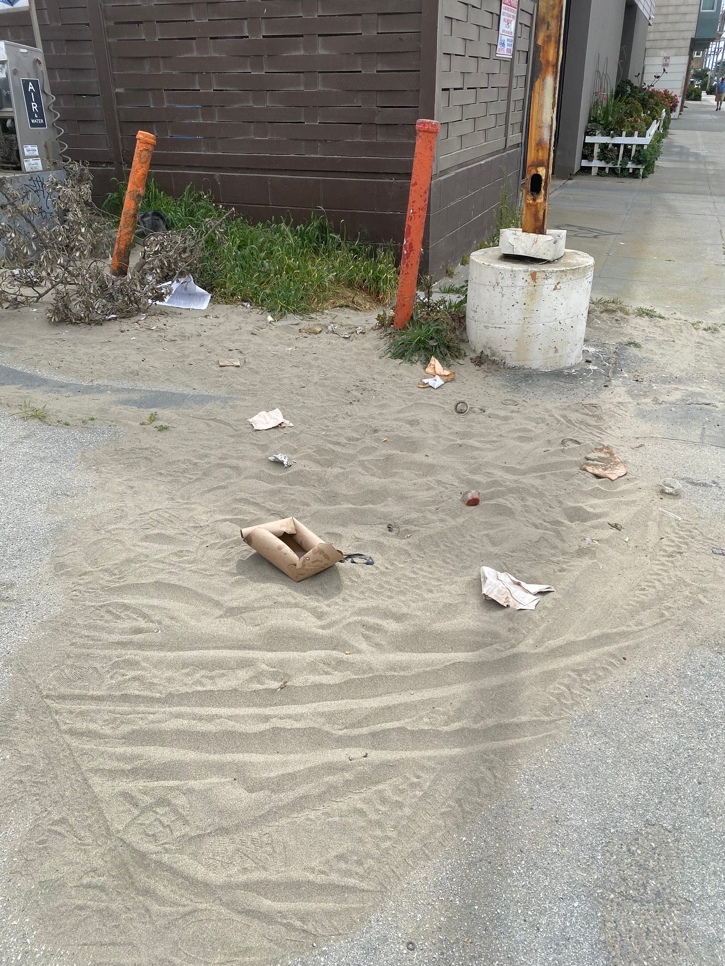 After quite a bit of drum-beating, City crews showed up last week, moved some sand, cleared some sidewalks, cleared out around the Taco Truck and an automated e-bike rental rack and then took a break for a week. Oh, they also drove a street sweeper down the street at 3:00 a.m. one morning (perhaps a little bit spiteful but not as much as taking a break for a week). The last few days a crew picked up garbage strewn about the area, not all of it, just some of it. They bagged it up and left it street-side at the curb.