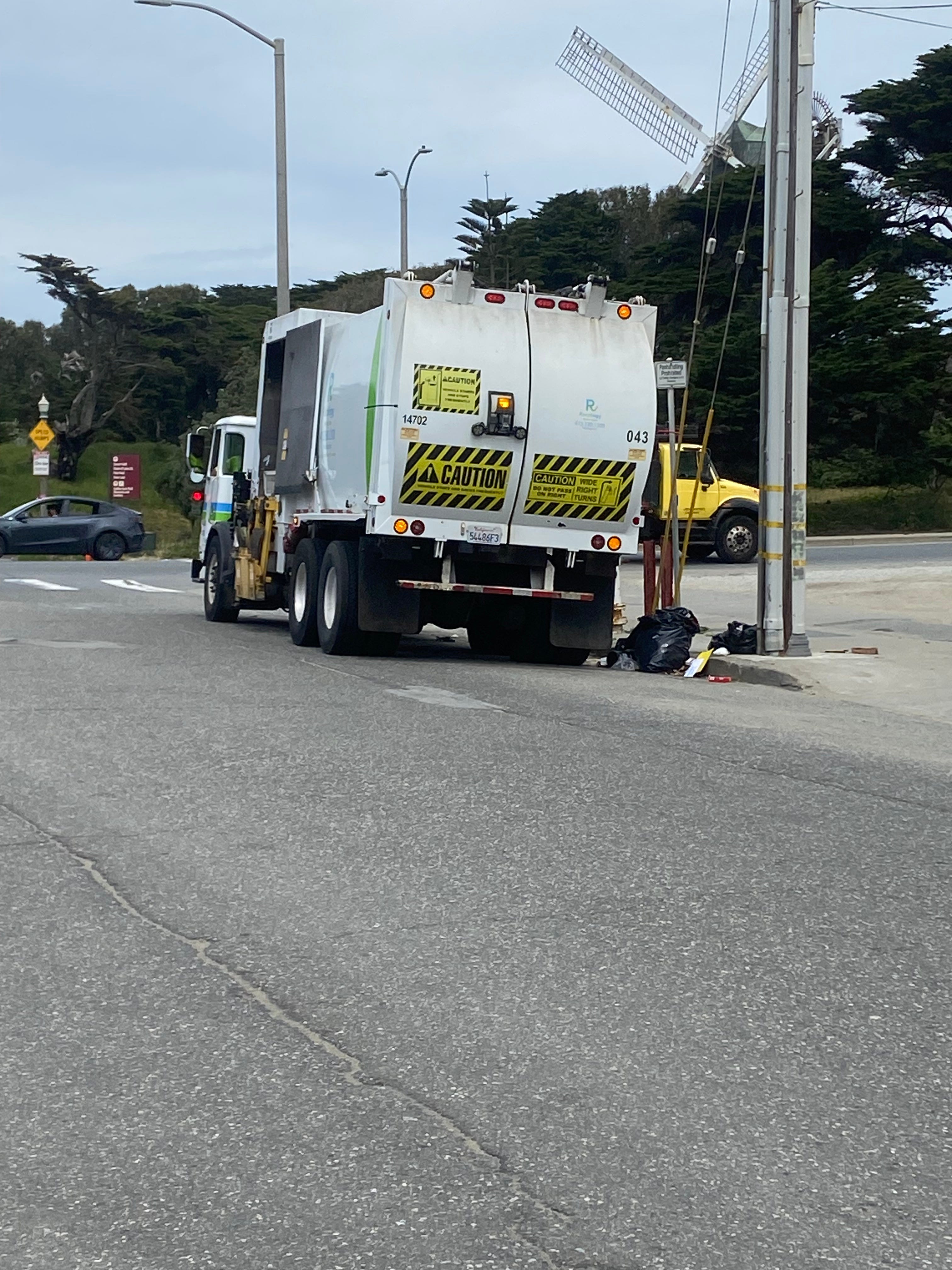 Then she went out and shot a picture of the garbage truck that was called to pick up the garbage collected by the City crew, which stopped right beside the four bags full of trash, sitting there for 5 minutes (another break for coffee and a sandwich maybe). And then Dougherty shot a video of the garbage truck driving away without picking up so much as a single bag of garbage, or anything else.